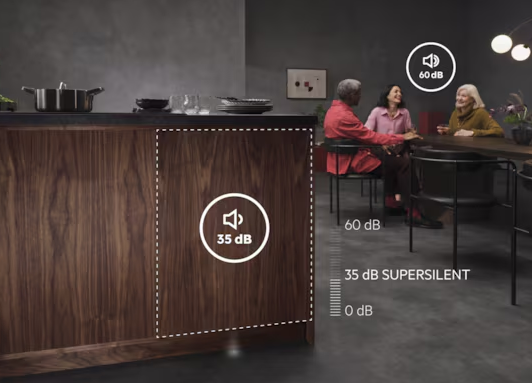 Vďaka optimalizovanému softvéru a dokonale vyladenému hydraulickému systému ponúka umývačka SuperSilent najtichšiu prevádzku na trhu. S mimoriadne nízkou hlučnosťou len 37 dB je taká tichá, že nebudete vedieť, že je zapnutá.