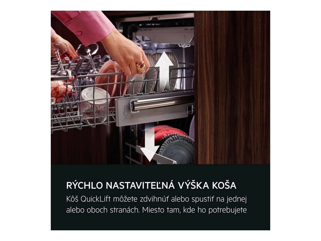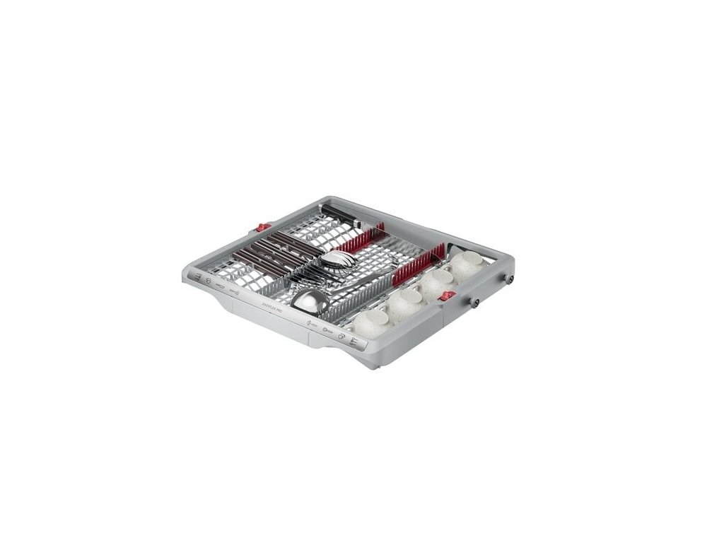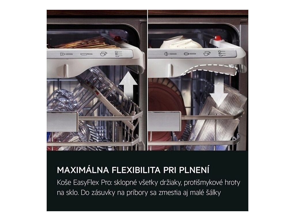 Koše EasyFlex Pro sa plynulo vysúvajú a všetky časti sa dajú sklopiť pre maximálnu flexibilitu. Protišmykové gumové úchyty a hroty bezpečne držia poháre na stopke aj ostatné poháre a bránia ich vzájomnému narážaniu. Do zásuvky na príbor sa zmestia metličky, naberačky aj malé šálky.