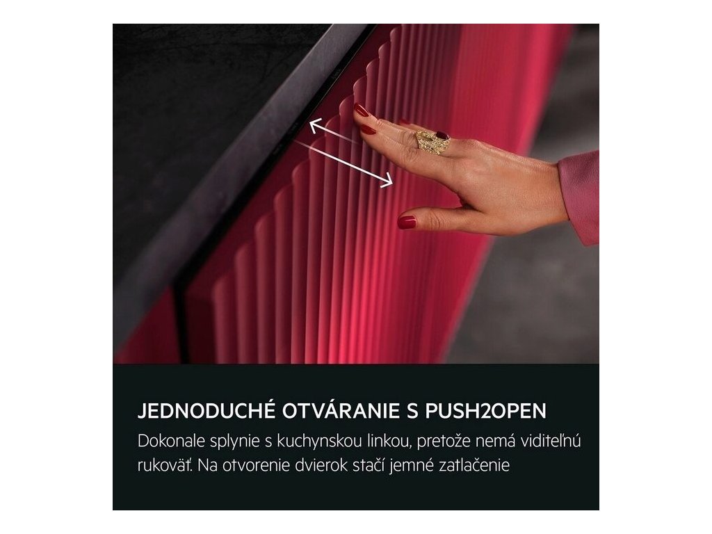Dvierka Push2Open bez viditeľnej rukoväte umožňujú dokonale začleniť umývačku medzi kuchynské skrinky. Na otvorenie stačí jemne zatlačiť na hornú časť v strede dvierok.