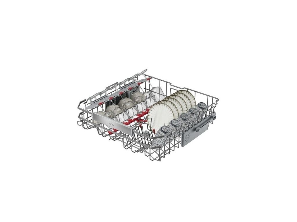 - Vlastnosti horného koša: 2 front folding tines for glasses with tine caps, 2 front folding tines for saucer with tine caps, 2 mäkké gumové špičky , 6 úchytov na poháre na víno, sklopné držiaky na poháre, Stainless steel handle AEG