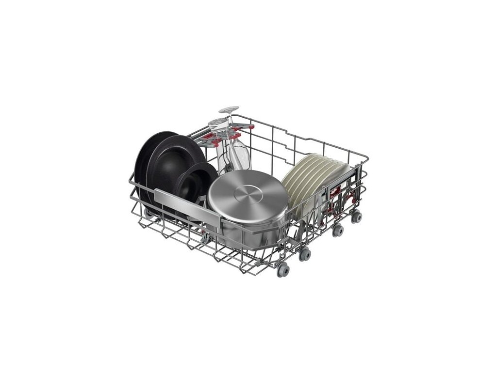 - Dolný košík s: 4 front foldable tines with tine caps, 4 rear foldable tines with tine caps, glasscare support for wine and beer glasses, oven tray support, antikorová rukoväť, Tall flat rack frame