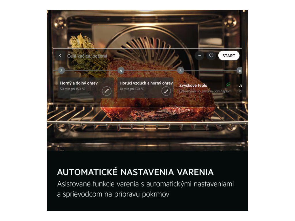 - Elektronické funkcie: 111 variety of pre-set cooking programmes ""Assist"" (weight/food sensor), 5 Multi Step Cooking Functions, 34 Languages, akustický signál, ovládanie aplikácií, automatické vypnutie (len rúry), nastaviteľná hlasitosť zvukového upozornenia, Check Result (Finish Assist by remaining 10% duration) (""Use residualt heat"" screen + beep), Child lock (in off mode), Clock style in standby (digital), konektivita, čas varenia, čas varenia s odhadovaným koncom, stopky, demo program s kódovaním, nastavenie jasu displeja, Display Full colour TFT touch 4.3 inches (add form factor), elektronická regulácia teploty, Electronical door switch, rýchle predohriatie s výberom možností, senzor pokrmu, automatické vypnutie senzoru pokrmu, ukazovateľ teploty senzoru pokrmu, senzor pokrmu s odhadom času, tóny tlačidiel a tóny alarmu a chýb - aktivácia / deaktivácia (okrem ZAP/VYP), jazyky / textový displej, hlavný vypínač, denná pamäť 3 dni späť, minútka, Oven light on/off selectable (2 ways: menu, direct access on home screen), OTA programming (excluding power board), ukazovateľ skutočnej teploty (°C) , indikácia zvyškového tepla (°C), využitie zvyškového tepla, Short cut keys in standby screen, servisné informácie, odporučaná teplota, denný čas