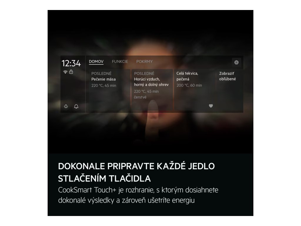 Displej CookSmart Touch+ vám spríjemní varenie, navedie vás k správnemu nastaveniu rúry a zároveň pomôže šetriť energiu. Obľúbené pokrmy a postupy si môžete uložiť do aplikácie a odoslať do rúry jedným stlačením tlačidla.
