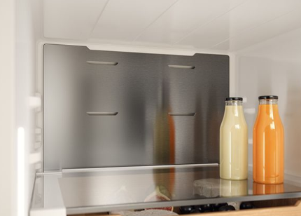 Zadná stena z nerezovej ocele sa ľahko čistí a zabraňuje tvorbe biofilmu, ktorý môže byť nositeľom baktérií. Udržuje tak čerstvosť a chuť potravín. Nerezové prvky navyše dodávajú chladničke prémiový vzhľad a pomáhajú udržiavať nízku teplotu.
