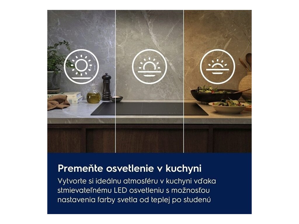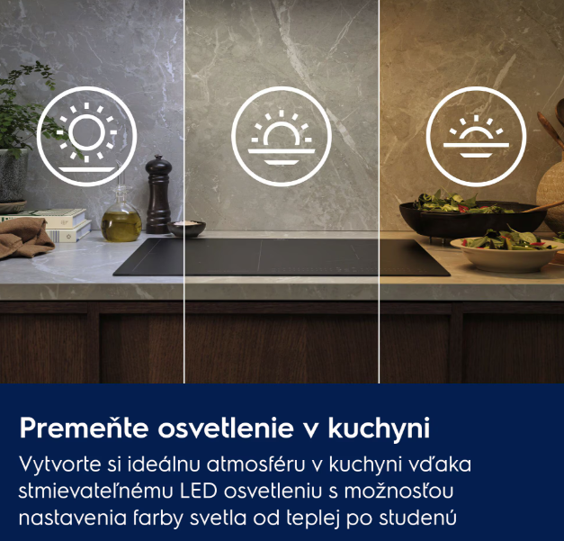 Perfektné osvetlenie ponúka prispôsobiteľnú atmosféru kuchyne. Stmievateľné LED svetlá rozjasnia celú vašu varnú plochu a zabezpečia výnimočnú viditeľnosť. Nastavte si intenzitu a teplotu svetla od studenej po teplú tak, aby ste dosiahli dokonalú kombináciu podľa svojich predstáv.