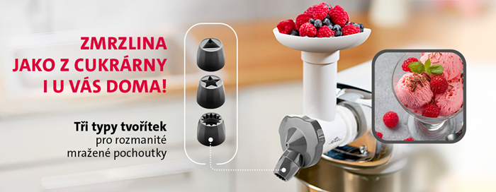 S nadstavcom na výrobu zmrzliny si jednoducho pripravíte čerstvú domácu zmrzlinu, krémový mrazený jogurt aj osviežujúci ľadový sorbet – presne podľa vlastných preferencií. Vďaka trom vymeniteľným formám môžete experimentovať s rôznymi konzistenciami a typmi mrazených dezertov. Či už máte chuť na klasickú smotanovú zmrzlinu, ovocný sorbet alebo ľahšiu jogurtovú alternatívu, s týmto nadstavcom máte celý proces plne pod kontrolou. Príprava je maximálne bezpečná vďaka tlačidlu, ktoré zároveň slúži ako praktický úložný priestor na formy – vždy ich tak budete mať prehľadne uložené na jednom mieste a pripravené na použitie.