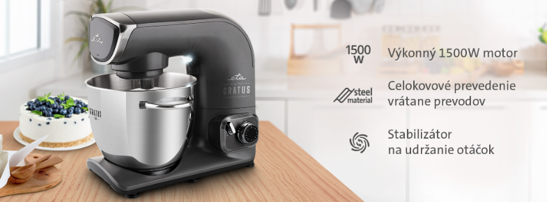 S výkonným motorom s príkonom až 1500 W a masívnym celokovovým prevedením zvládne kuchynský robot ETA Gratus EVO aj tie najnáročnejšie úlohy, ako je hnetenie cesta, prípravu krémových omáčok alebo nastrúhanie zeleniny do šalátu. Vďaka plynulej regulácii otáčok môžete rýchlosť miešania či šľahania prispôsobiť surovinám a planetárny systém miešania zaistí rovnomerné spracovanie celého obsahu misy. Nastavené otáčky si ETA Gratus EVO dokáže udržať aj pri veľkom zaťažení. Hnetenie cesta či šľahanie šľahačky preň nie je žiadny problém. Robotu nechýba ani funkcia PULSE pre maximálne otáčky.