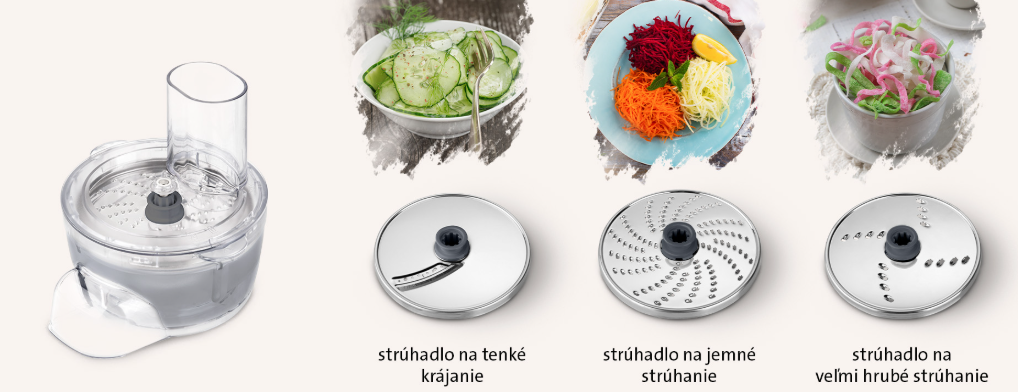 Nadstavec na strúhanie s 3 diskovými strúhadlami a prevodovkou pre optimálne otáčky vám uľahčí strúhanie zeleniny, ovocia, zemiakov aj syrov a ďalších potravín. S týmto nadstavcom ušetríte čas aj námahu a ku klasickému strúhadlu sa nebudete chcieť vrátiť.