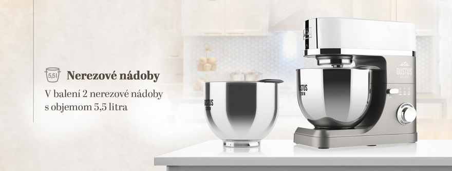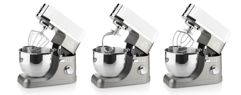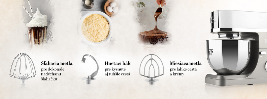 Medzi príslušenstvom nájdete tiež 3 druhy nadstavcov – šľahacia, miešacia metla a hnetací hák. Hutné cesto na chlieb aj dokonale nadýchanú šľahačku máte hotovú raz dva.