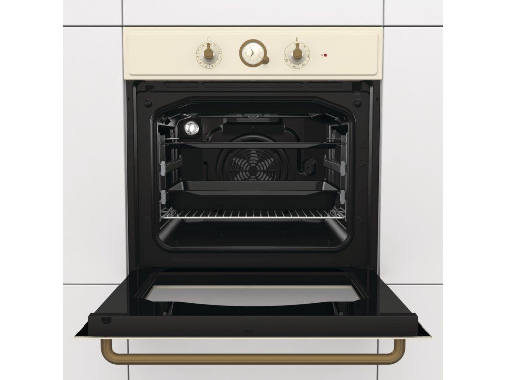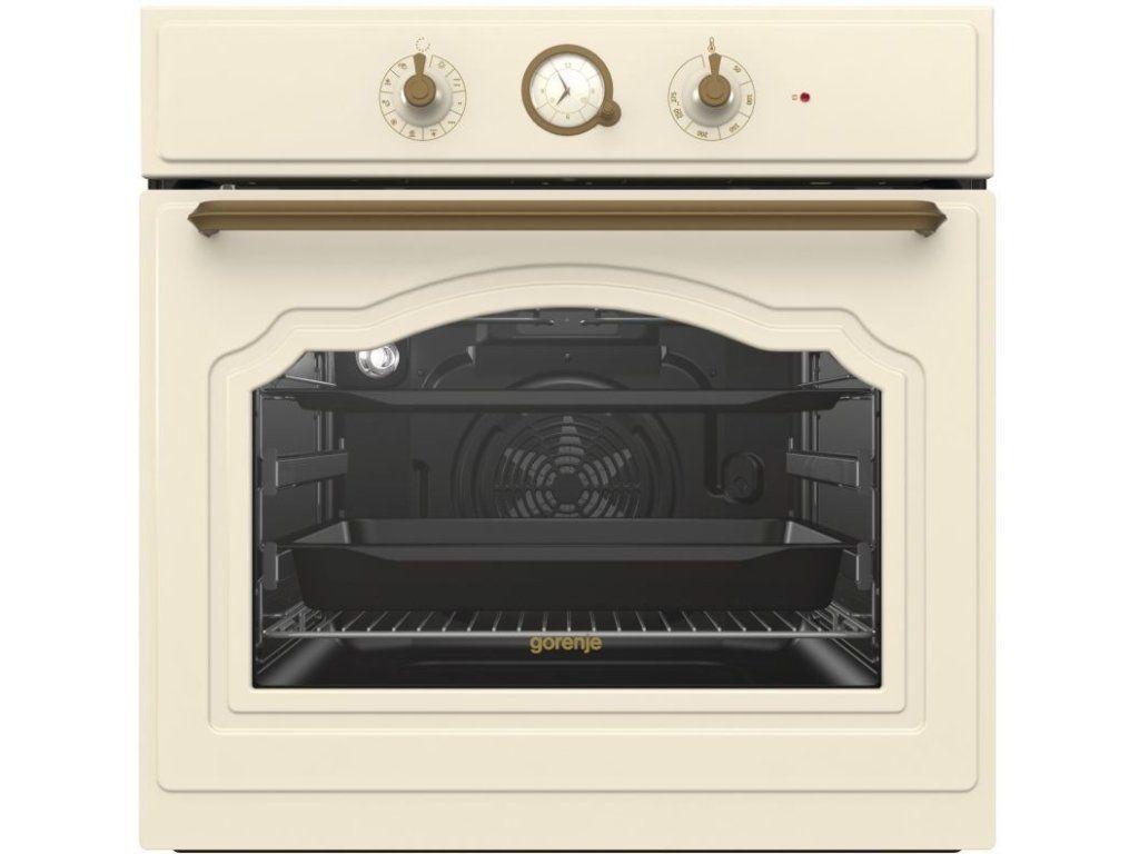 Klasický analógový dizajn elektronického programovateľného časovača vo vstavanej rúre Gorenje BO7732CLI je jedným z ozdobných prvkov tejto rady. Umožňuje programovanie oneskoreného času začiatku pečenia a konca času pečenia. Hodiny indikujú akustický signál ukončenia procesu pečenia. Klasický dizajn hodín s ručičkami a orámovaním v staro-zlatej farbe dopĺňa celkový dizajn rúry.