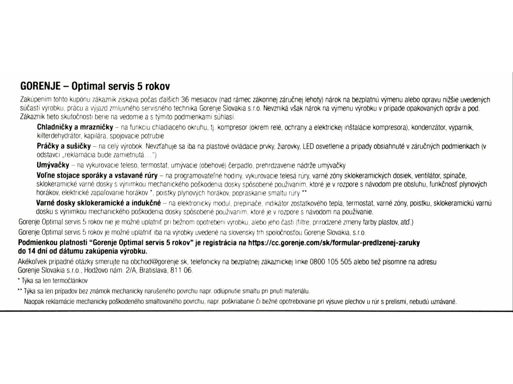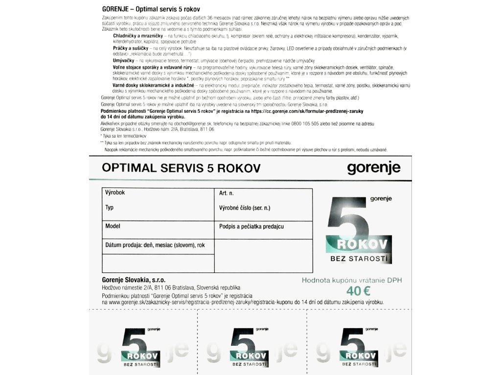 Podmienkou platnosti Gorenje Optimal servisu 5 rokov je registrácia na https://cc.gorenje.com/sk/formular-predlzenej-zaruky do 14 dní od dátumu zakúpenia výrobku.