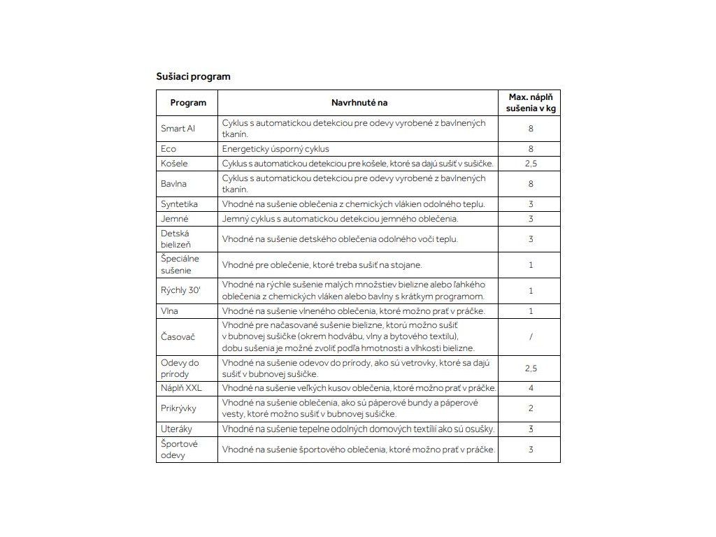 | Program | Max. náplň (kg) | Teplota (°C) | Otáčky (ot./min.) |