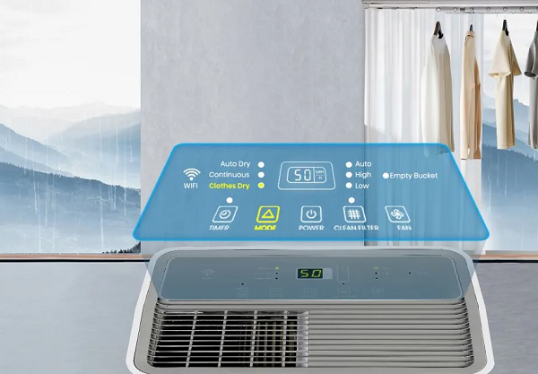 Na prehľadnom ovládacom paneli si môžete vybrať medzi 3 režimami (Auto dry – automatické sušenie, Continuous – nepretržité sušenie, Clothes Dry – sušenie oblečenia), 3 rýchlosťami ventilátora (nízka, vysoká, automatická), nastaviť vlhkosť v rozmedzí od 30 do 80 % a časovač od 0,5 do 24 hodín. Svetelné indikátory vás upozornia, keď je potrebné vyčistiť filter alebo vyprázdniť nádobu.