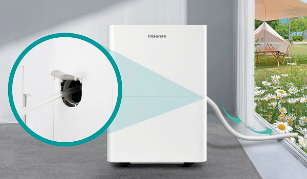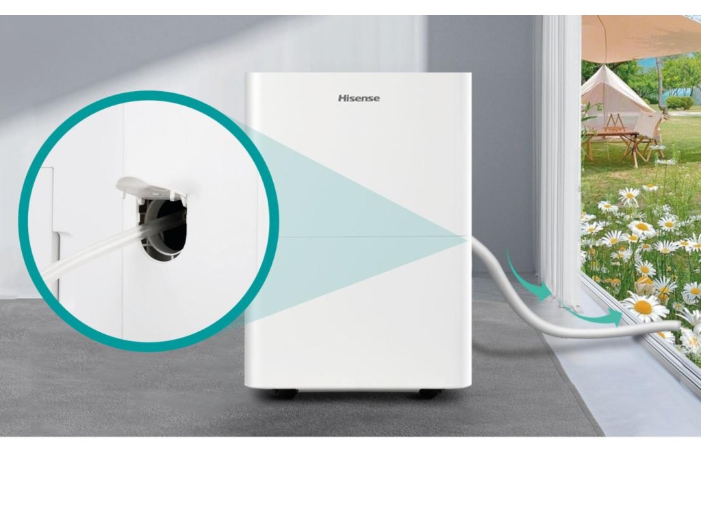 Odvlhčovač Hisense vám umožňuje pripojiť hadicu k odtokovému otvoru. Tým sa eliminuje potreba vyprázdňovať nádržku na vodu, pretože zhromaždená voda bude nepretržite odtekať cez hadicu do umývadla, odtoku alebo dokonca do kvetináča či záhrady.