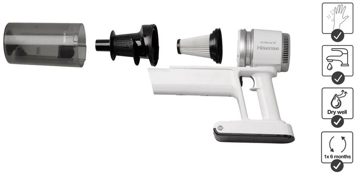 Ak chcete byť zdraví a šťastní, musíte žiť a pracovať v čistom prostredí. Akumulátorové vysávače Hisense sú ľahké a ľahko prenosné. Sú skvelou alternatívou k bežným vysávačom. Bez napájacieho kábla vás nebudú nijako obmedzovať. Tento vysávač sa v priebehu niekoľkých sekúnd zmení na praktický ručný vysávač a je ideálny na rýchle upratovanie, na ktoré máte len niekoľko minút. Pozrite si náš sortiment akumulátorových vysávačov Hi-Move IV. Spájajú elegantný dizajn so špičkovou technológiou a funkciami pre vždy dokonalé výsledky.