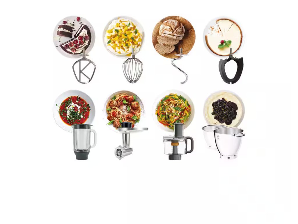 Rozšírte svoju kreativitu pomocou širokej ponuky 25 voliteľných nadstavcov (samostatne predajné). Podľa pripojenia k vysokorýchlostnému alebo pomalému výstupu budete mixovať, krájať na plátky, tvoriť špirály, strúhať, mlieť alebo pomaly vytláčať šťavu s dokonalým výsledkom.