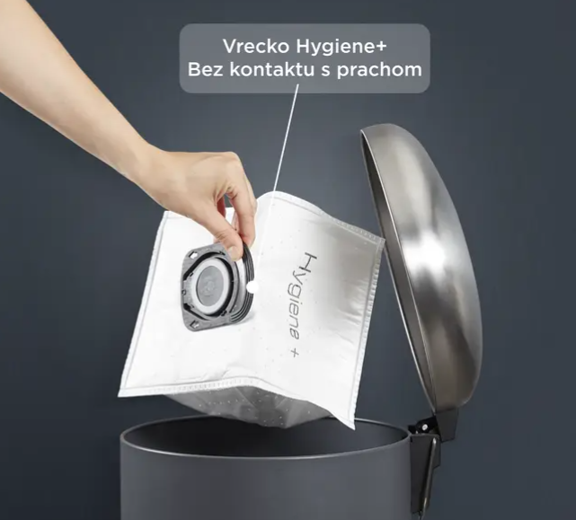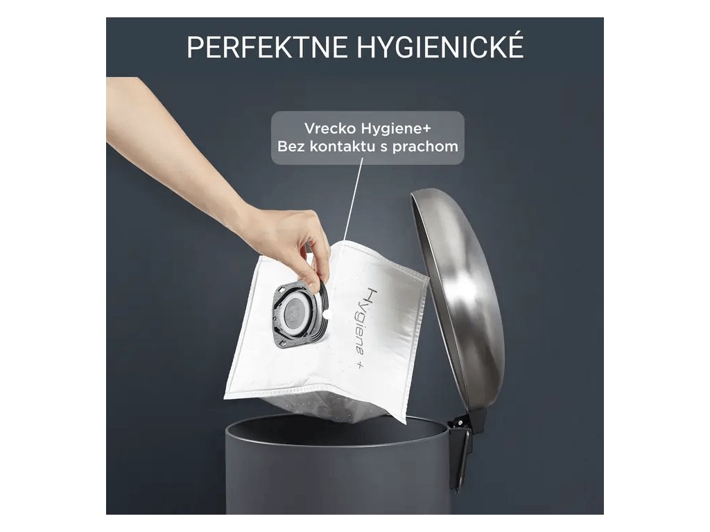 Už žiadne oblaky prachu pri výmene vďaka novému patentovanému vrecku Hygiene+, ktorý je opatrený samouzatváracou klapkou pre absolútne pohodlie a hygienu.
