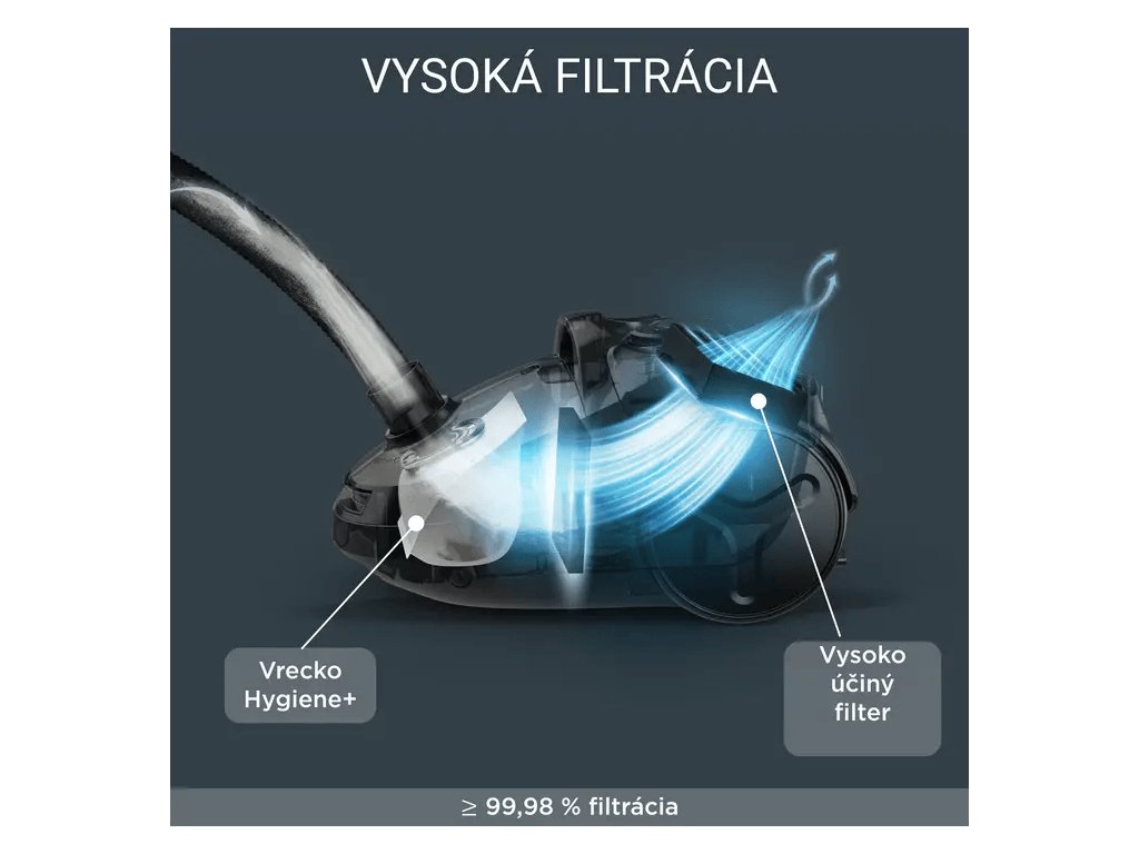 Už nie je potrebné meniť filtre! Vďaka technológii vysoko účinnej filtrácie je množstvo prachu zachyteného v High Efficiency filtri tak malé, že ho nemusíte umývať ani meniť po celú dobu životnosti výrobku (len pri použití originálnych vreciek Rowenta Hygiene+).