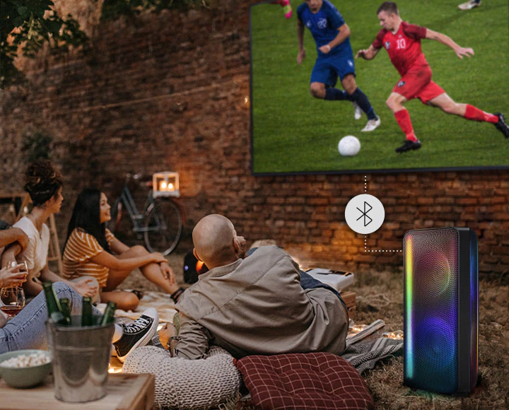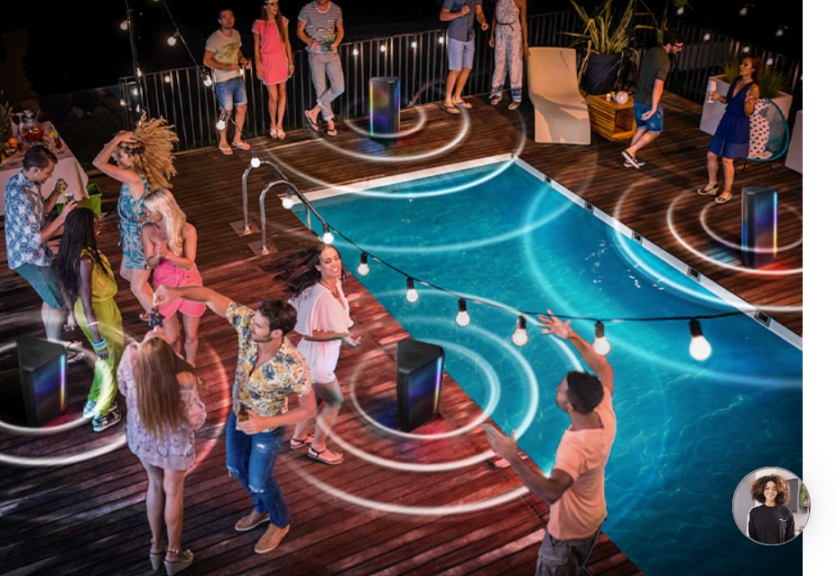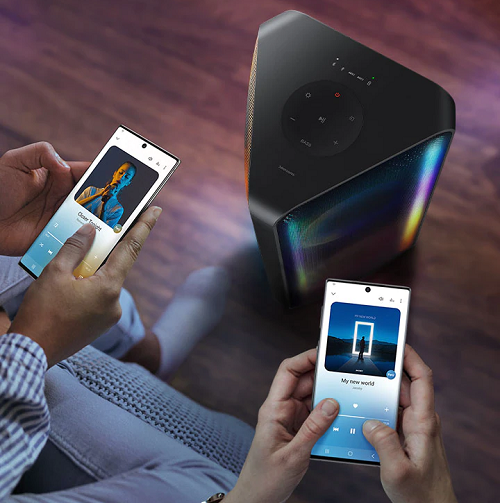 Vďaka podpore Group Play bude vaša párty žiť. Pripojte niekoľko zariadení Samsung Sound Tower – pomocou kábla alebo bezdrôtovo – aby bol zvuk ešte bohatší.